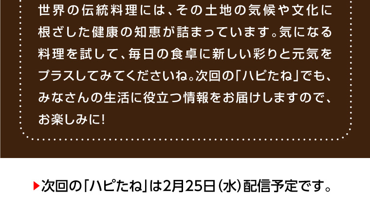 - ちょっと素敵な生活情報 ◎ハピたねvol.156 ◎美味しく健康に!「世界の伝統料理」